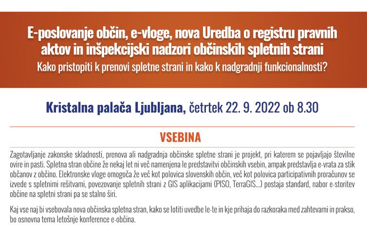 Zagotavljanje zakonske skladnosti, prenova ali nadgradnja občinske spletne strani je projekt, pri katerem se pojavljajo številne ovire in pasti. Spletna stran občine že nekaj let ni več namenjena le predstavitvi občinskih vsebin, ampak predstavlja e-vrata za stik občanov z občino. Elektronske vloge omogoča že več kot polovica slovenskih občin, več ko polovica participativnih proračunov se izvede s spletnimi rešitvami, povezovanje spletnih strani z GIS aplikacijami (PISO, TerraGIS...) postaja standard, dostopnost e-storitev na spletni strani pa se stalno širi.