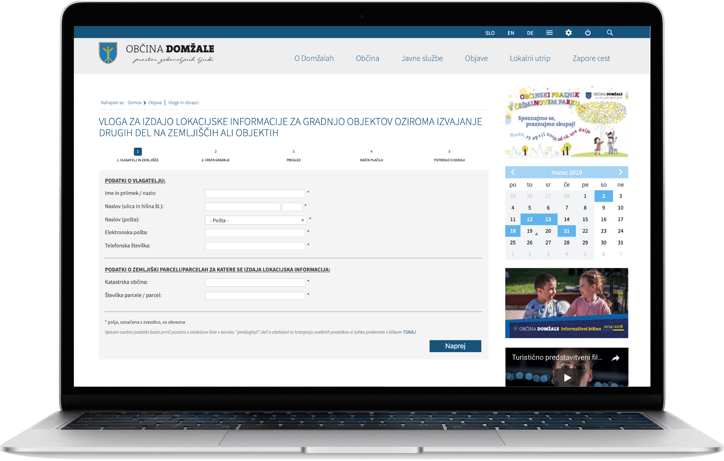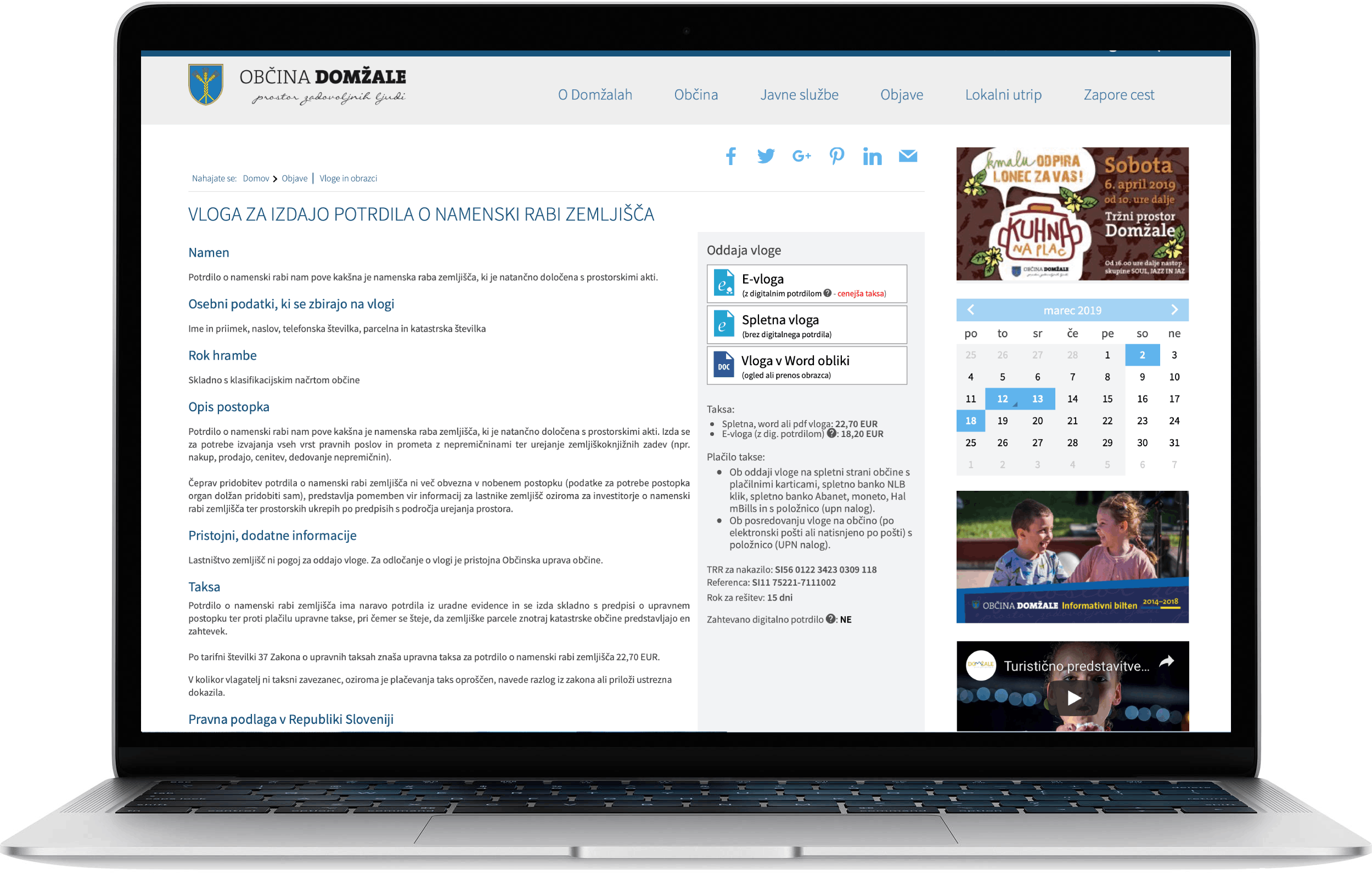 Spletna stran e-občina kot edina spletna stran v Sloveniji omogoča celovit e-stik občine z občani z e-vlogami, spletnim plačevanjem taks, SMS in e-mail obveščanjem občanov, predlogi in pobude občanov, katalog informacij javnega značaja... Za zakonsko skladnost so pripravljeni splošni pogoji in avtorske pravice, center za varstvo osebnih podatkov, pogodbe o obdelavi osebnih podatkov, pravilniki in politike zasebnosti...