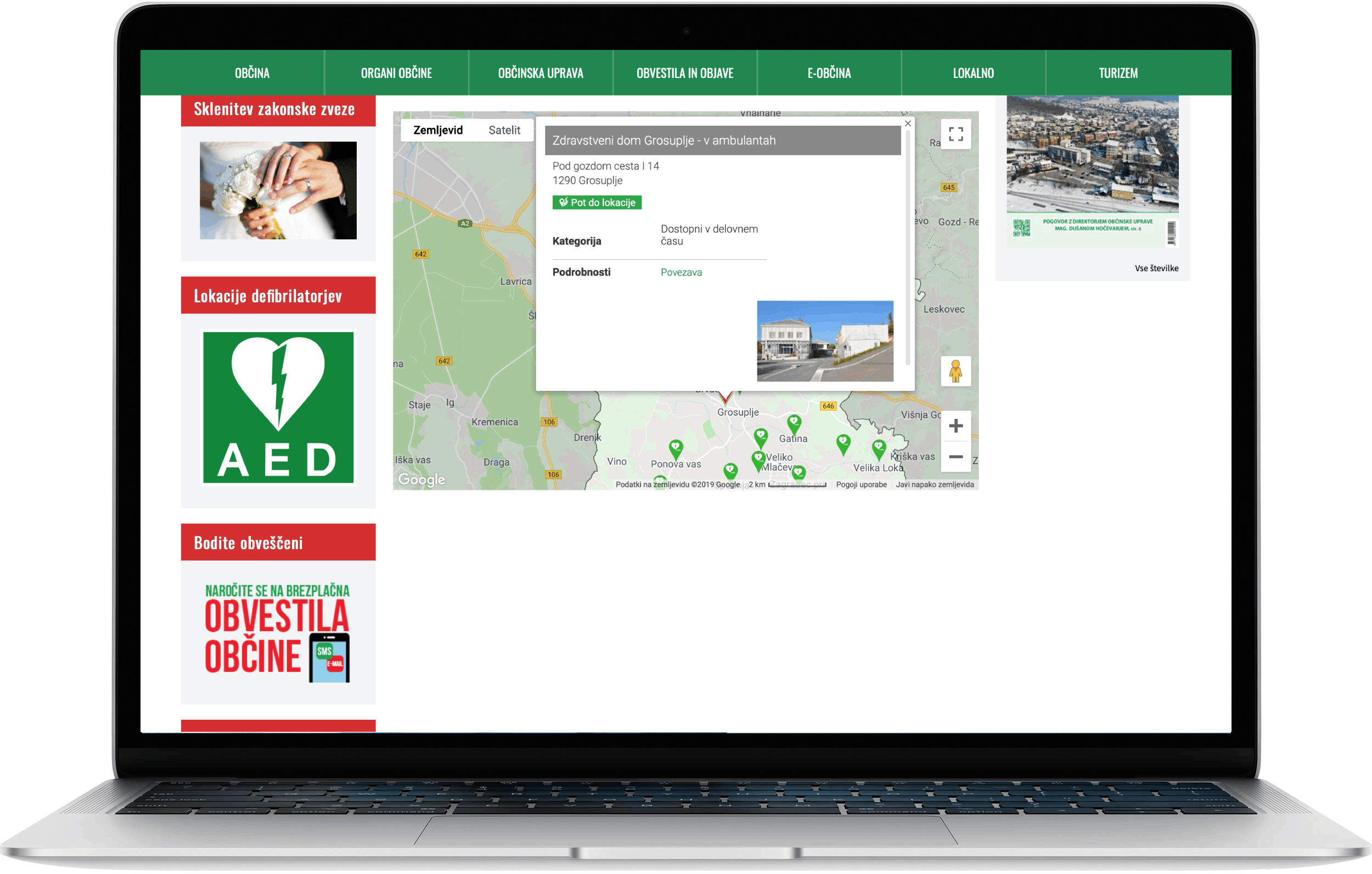 V času ko občanu zastane srce, je vsaka sekunda življenskega pomena. Modul omogoča prikaz lokacij defibrilatorjev v občini na zemljevidu in tudi vodenje do lokacije najbližjega defibrilatorja.