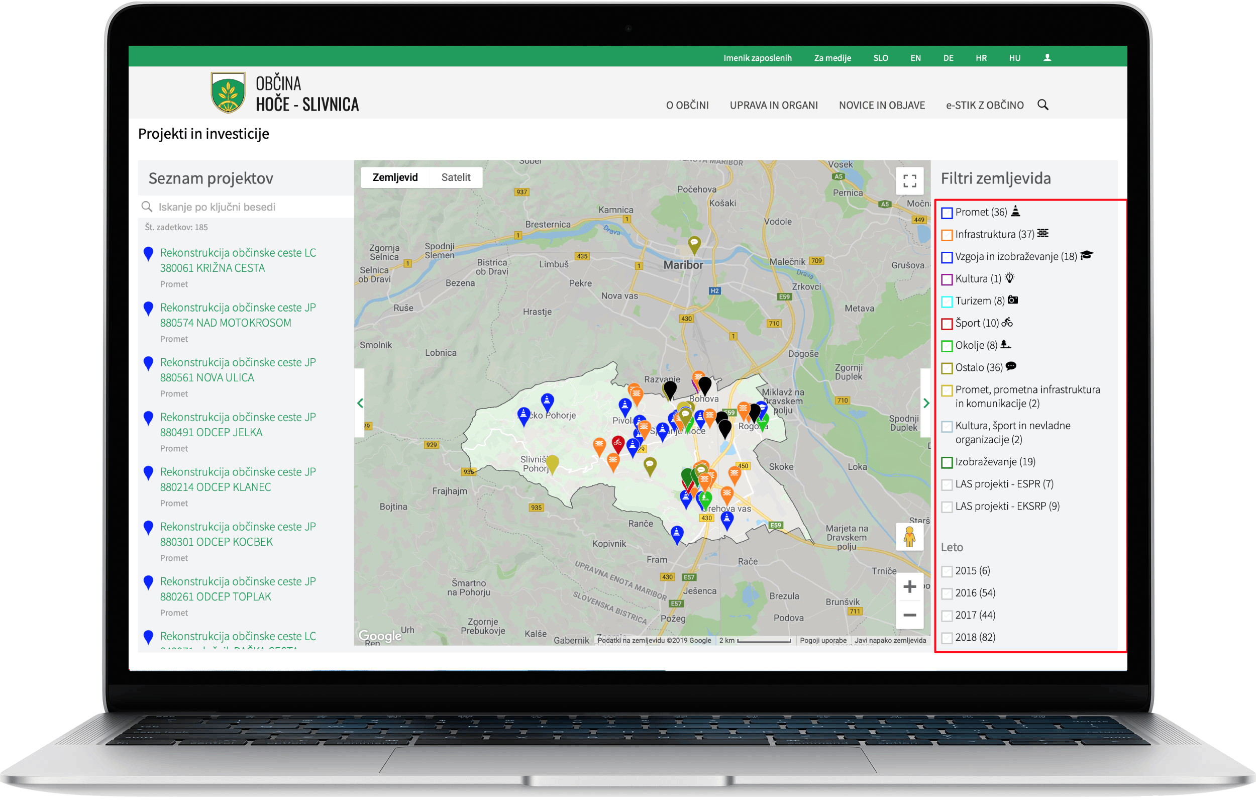 | MOŽNST FILTRIRANJA PROJEKTOV: PO PODROČJU, LETU, KRAJEVNI SKUPNOSTI, VIRU SREDSTEV, STATUSU, VREDNOSTI... |