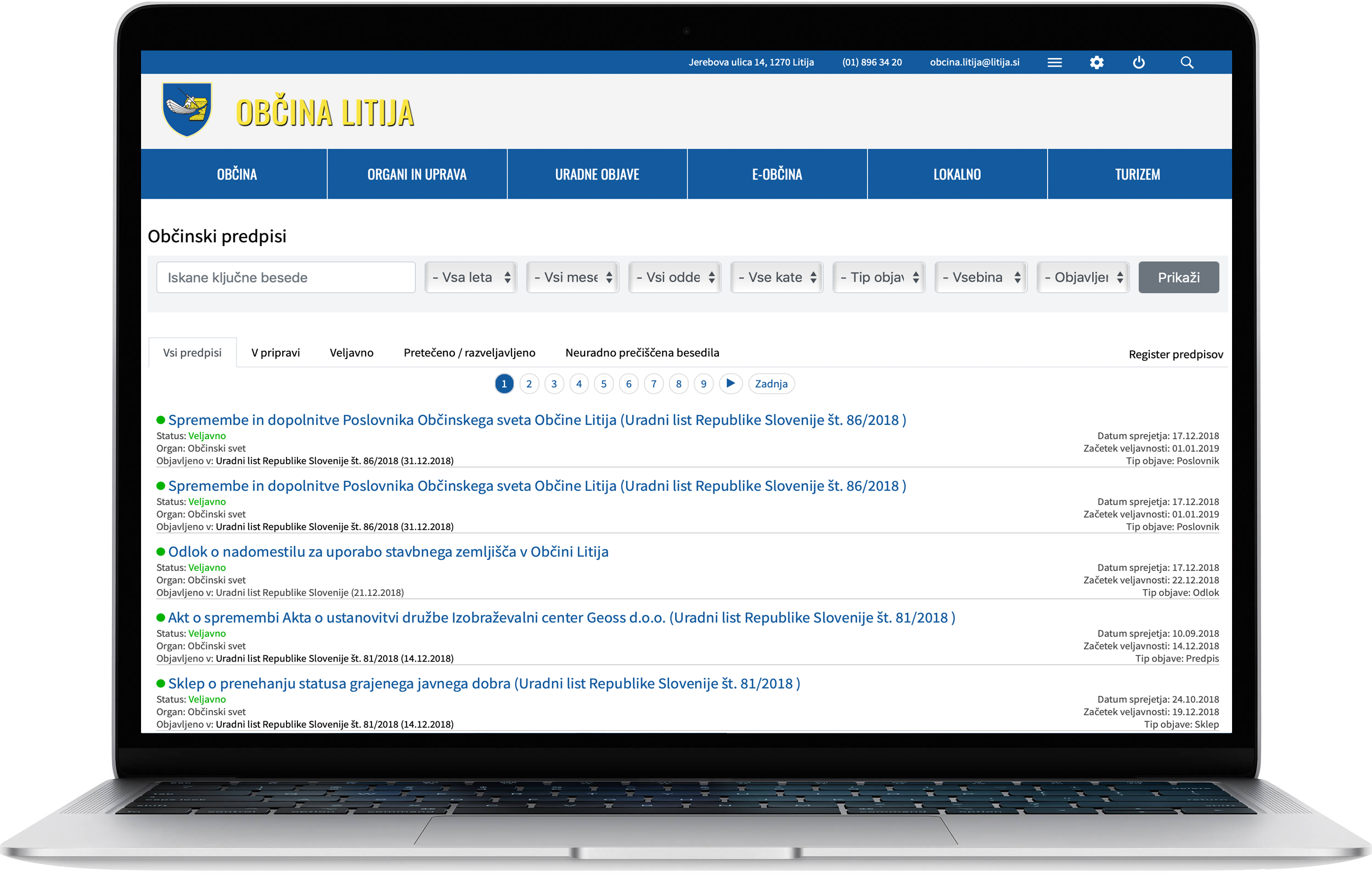Objava vseh predpisov na spletni strani občine zagotavlja transparentnost poslovanja občine, saj omogoča napredno iskanje po predpisih, predpisi pa so v zavihkih grupirani po statusu sprejetja. Za vsak predpis si je mogoče ogledati podatke o sprejemu predpisa, morebitne priloge na predpisu (npr. grafični del) in kronologijo predhodno sprejetih predpisov. Svetniki si lahko pred vsako sejo ogledajo predvidene predpise za sprejem, naknadno pa je vidno za vsako sejo kateri predpisi so bili na seji obravnavani. Ob vsakem vnosu predpisa se določi vsebina predpisa in se tako avtomatično generira še razvid predpisov - prikaz predpisov po vsebini.